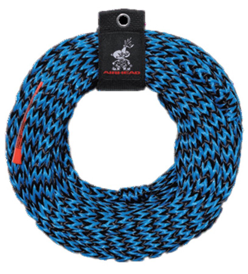 This heavy-duty, 1/2" x 60', 16-strand tube tow rope is engineered to easily pull one- to three-rider tubes. This durable, high-quality polypropylene rope floats and delivers 3,350-pound tensile strength. Features an eyecatching bright blue and black color scheme and a 6" loop spliced at each end. Package includes a rope keeper for convenient storage.