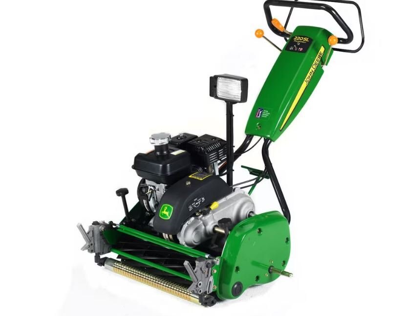 No matter the type of reel cutting unit or surface being mowed, there are two ways to measure height of cut. The first measure is called benchsetting height of cut. This height of cut is established by using a gauge bar and measuring the distance from the bottom of the rollers to the top edge of the bedknife. This serves as an initial guide for establishing the cutting height. However, the cutting unit may not be mowing exactly at this height. Other factors come into play, such as softness or firmness of the mowing surface, thatch, turf density, roller shape and surface area, and weight, just to name a few. More than likely, after these factors are taken into consideration, the turf is being mowed at a height less than the benchsetting height of cut. The actual cutting height is called effective height of cut. How is the effective height of cut measured? It can only be measured with a prism gauge, which uses a series of mirrors to visually show the horizontal profile of the turf. The prism essentially shows the turf rotated upward 90 degrees, so the actual height of cut can easily be seen. Understanding effective height of cut versus benchsetting height of cut is critical when evaluating a greens mower. Traditional fixed-head walk-behind greens mowers such as the 180SL, 220SL, and 260SL will almost always cut at a lower effective height of cut compared to recent floating-head walk-behind greens mowers. In order to establish the same effective height of cut, the fixed-head walk-behind greens mower should be set at a higher benchsetting height of cut. Why? All of the weight of the fixed-head walk-behind greens mower is distributed to the rear drum and front roller. The weight on the actual cutting head of a floating-head mower comes from the cutting unit itself, not the traction unit. Essentially, the floating-head walk-behind greens mower is similar to a one-gang triplex in that regard. So, isn't a floating-head walk-behind greens mower friendlier for the turf? The answer is no. Traditional fixed-head greens mowers stay engaged in the turf, helping to minimize thatch buildup and maintain a consistent height of cut. This may result in less thatch issues over time depending on other agronomic practices. Floating-head walk-behind greens mowers tend to ride over the top of the turf due to the light weight of the cutting unit actually in contact with the turf. This non-aggressive nature may result in significant thatch accumulation over time unless other agronomic practices are implemented. Both types of mowers are affected by changing conditions. Both will require height-of-cut changes as conditions soften. The difference is that the 180SL, 220SL, and 260SL will always cut at a consistent height of cut due to their weight distribution and balance, whereas floating-head walk-behind greens mowers cannot make the same claim. For maximum contour-following capability in severe undulations, the John Deere 180SL performs exceptionally. With a narrow 18-in. (45.7 cm) frame, fixed grass catcher, and narrow overlap, the productivity of the 180SL is roughly equal to that of 21-in. (53.34 cm) floating-head walk-behind greens mowers. |