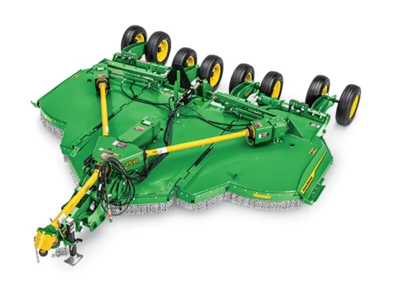 John Deere flex-wing rotary cutters are available in three duty-level categories and four width sizes. E-Series Flex-Wing Cutters are designed for your utility tractor to increase efficiency in each pass. They are ideal for making short work of grass, weeds, small bushes, and light shrubs. The E Series is a rotary cutter that targets small farm owners and large homesteads, but with its 5.1-cm (2-in.) diameter cut capacity, it is applicable for all types of livestock pastures, as well as general mid-duty property maintenance applications. Improved pasture maintenance results in better growth of edible plant material. The E Series allows flex-wing operators to use a smaller tractor with a minimum 29.8 power take-off (PTO) kW (40 PTO hp), which means fuel savings. It is available both in 4.6-m (15-ft) and 3.6-m (12-ft) sizes, providing increases productivity and terrain coverage. The E Series is equipped with a 540-rpm Category 5 driveline, rigid axles with four puncture-proof laminated tires, and round pan-type blade holders. The E Series shares many design features of the M and R Series, such as the easy-clean deck, round blade pans, and a cast self-leveling clevis hitch. M-Series Flex-Wing Cutters are suited for larger property owners and ag producers. A flex-wing rotary cutter is the best way to go when dealing with large areas and uneven terrain. Get a lot done on the job and then fold up the wings for easy transport. Choices include 540 PTO rpm or 1000 PTO rpm, laminated or severe-duty ag tires, and round stump jumper or bar-type blade holder. Put these M-Series Rotary Cutters to work reclaiming overgrown pastures, mowing rights-of-way, and chopping row-crop residue. With the redesigned cutting chamber, you are ready with great capacity and better crop flow. That means an unrestricted airflow, which translates into cleaner cutting and more uniform distribution of cut material. A tractor with a minimum of 41 PTO kW (55 PTO hp) is required. The type and volume of material being cut will affect horsepower requirements. R-Series Cutters are designed to multi-task in tough conditions, from cleaning roadside ditches to cutting under power line easements, recovering Conservation Reserve Program (CRP) land, airfield mowing, and road-rail verges. The R-Series range is ideal for contractors and government users requiring an industrial-strength machine with a narrow road transport width. The R-Series Flex-Wing Rotary Cutter was engineered for the toughest roadside mowing and commercial applications. It comes in the standard 4.6-m (15-ft) and 6.1-m (20-ft) dual-wing configurations and in a right-wing-only weight-box configuration. The 3.1-m (10-ft) FC10R Weight-Box Rotary Cutter is designed from the FC15R base model and incorporates many of the same features, but it is specifically enhanced for roadside cutting. The left wing of the cutter is removed and replaced with a weight box to provide stability for the unit. This allows the tractor to be operated alongside the road for mowing. Municipalities and commercial mowing operators utilize these units for roadside mowing where a full-sized unit is too wide and where the desired roadside cutting width is less. It is available in 540 rpm only. The main difference between the R-spec and M-spec models is that the R-spec is a heavier, more durable rotary cutter that can handle more challenging conditions and terrains for longer working times. A thicker deck, standard deck rings, ball hitch, independent wing hydraulics, and larger tires. The terrain and type and volume of material being cut affect horsepower requirements.