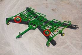 John Deere’s mechanical wing control helps producers keep their frames level for five-section disks. Mechanical wing control is included in base equipment for all five-section 2630 Series Disks. With this feature, a large spring is placed in the wing frame on each side of the disk. As the pivot point in the wing starts to raise, the spring presses against that point to keep the disk level through tough field conditions. The red circles in the following image illustrate the area of the disk where the large spring is placed in the wing frame.