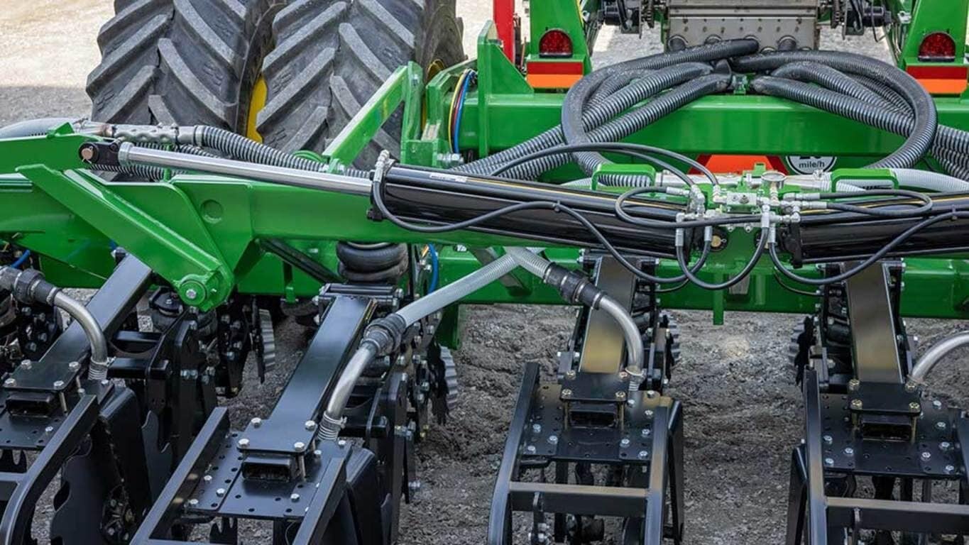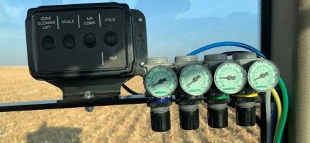 To enable consistent operating depths across the machine, the downforce system is split into two circuits: one for row-units that are running in wheel tracks (blue airline) and one for the remaining row-units (black airline). This allows for independent control of the rows running in a potentially more compacted portion of the machine. Operators can observe the parallel linkage position across the rows while operating and adjust the downforce as needed. The display will not read depth in inches. To accurately determine the depth, the operator needs to manually dig test strips to measure the actual depth and make any necessary adjustments to the airbag pressure.